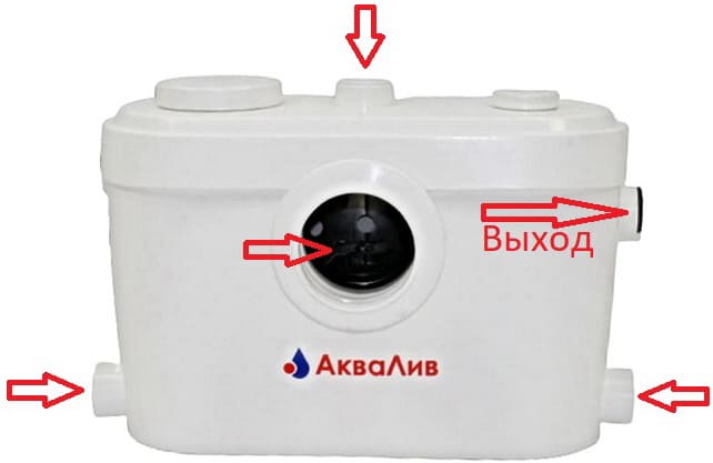 Входы слева и справа канализационного насоса принимают воду от других приборов: умывальник, душ, стиральная и посудомоечная машины.